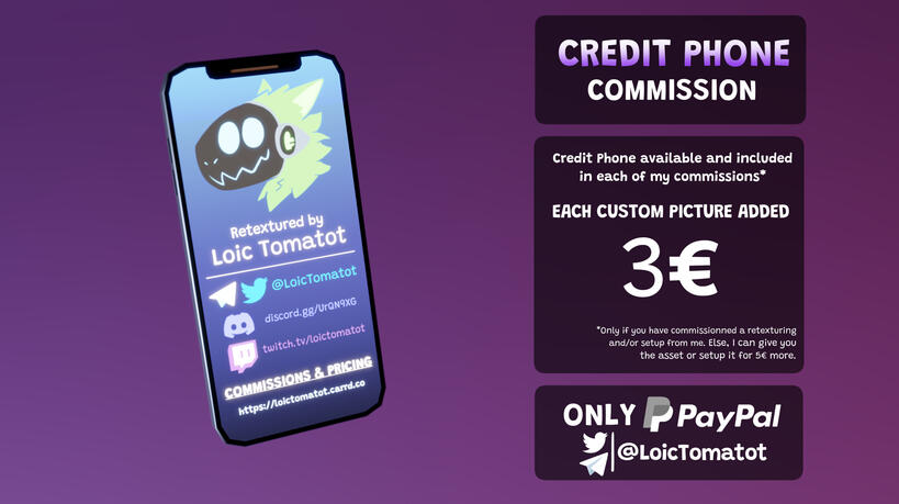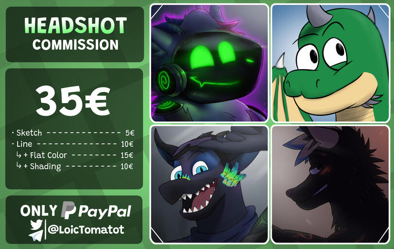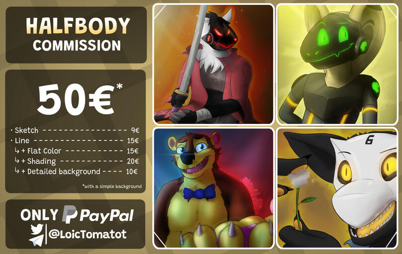Retrouvez ci-dessous les tarifs de base applicables sur la plupart des demandes de commissions.Pour connaitre l'état d'ouverture des commissions, rendez-vous sur le trello dédié.